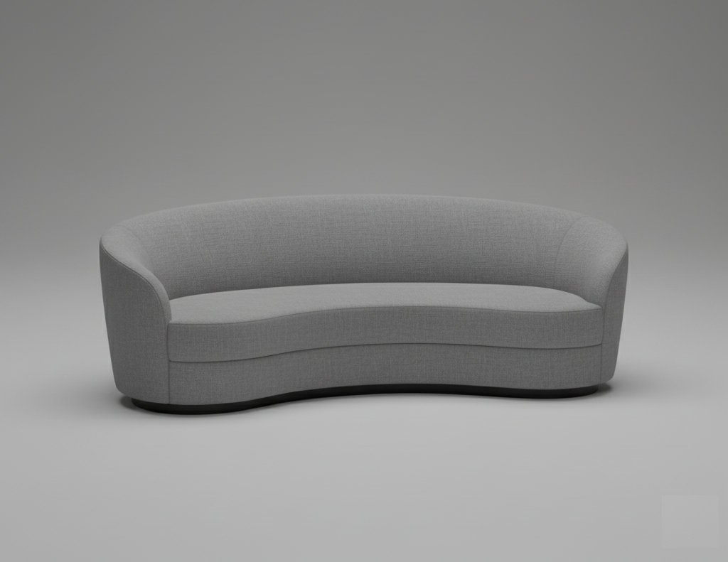 التصميم: أريكة حديثة بتصميم أنيق وبسيط، مغطاة بقماش رمادي منحني على شكل هلال أو نصف قمر، مما يخلق مظهرًا دافئًا ومريحًا يناسب الأجواء المهنية.